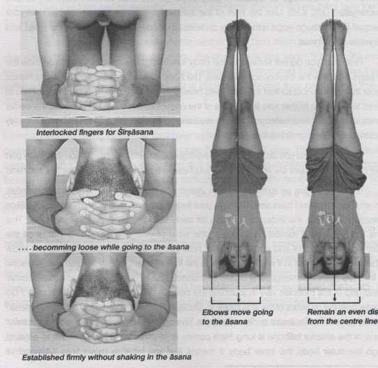Watch the elbows as you move into Sirsasana. The elbows should be directly under the shoulders as shown in the above photos on the right. The elbows should remain an even distance from the center line of the body. The moment students move into Sirsasana the elbows shift out away from the shoulders. This will place undo stress on the cervical spine. Refraining from ‘hopping’ up into Sirsasana and keeping the forearms firmly rooted onto the floor will help keep this from happening.