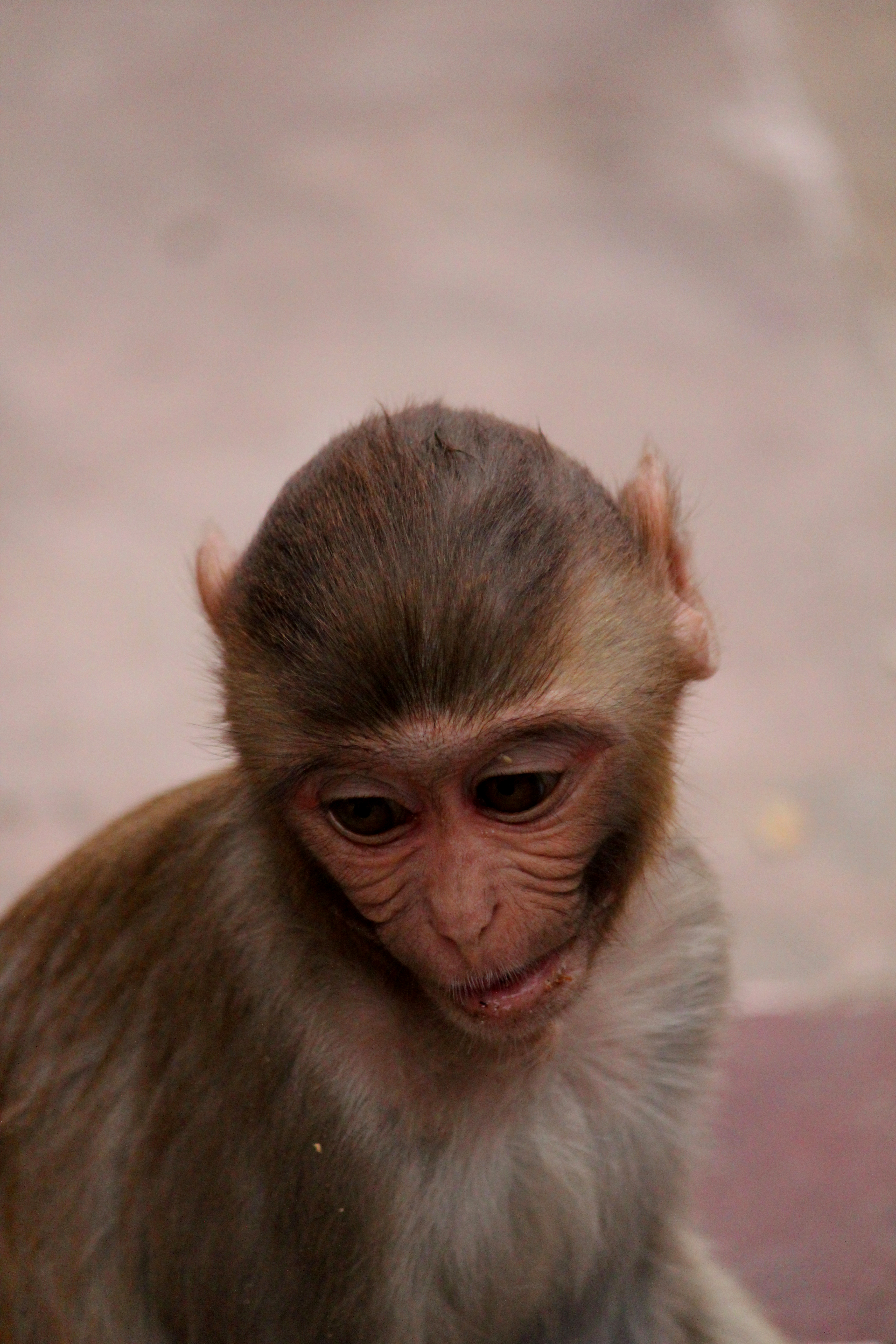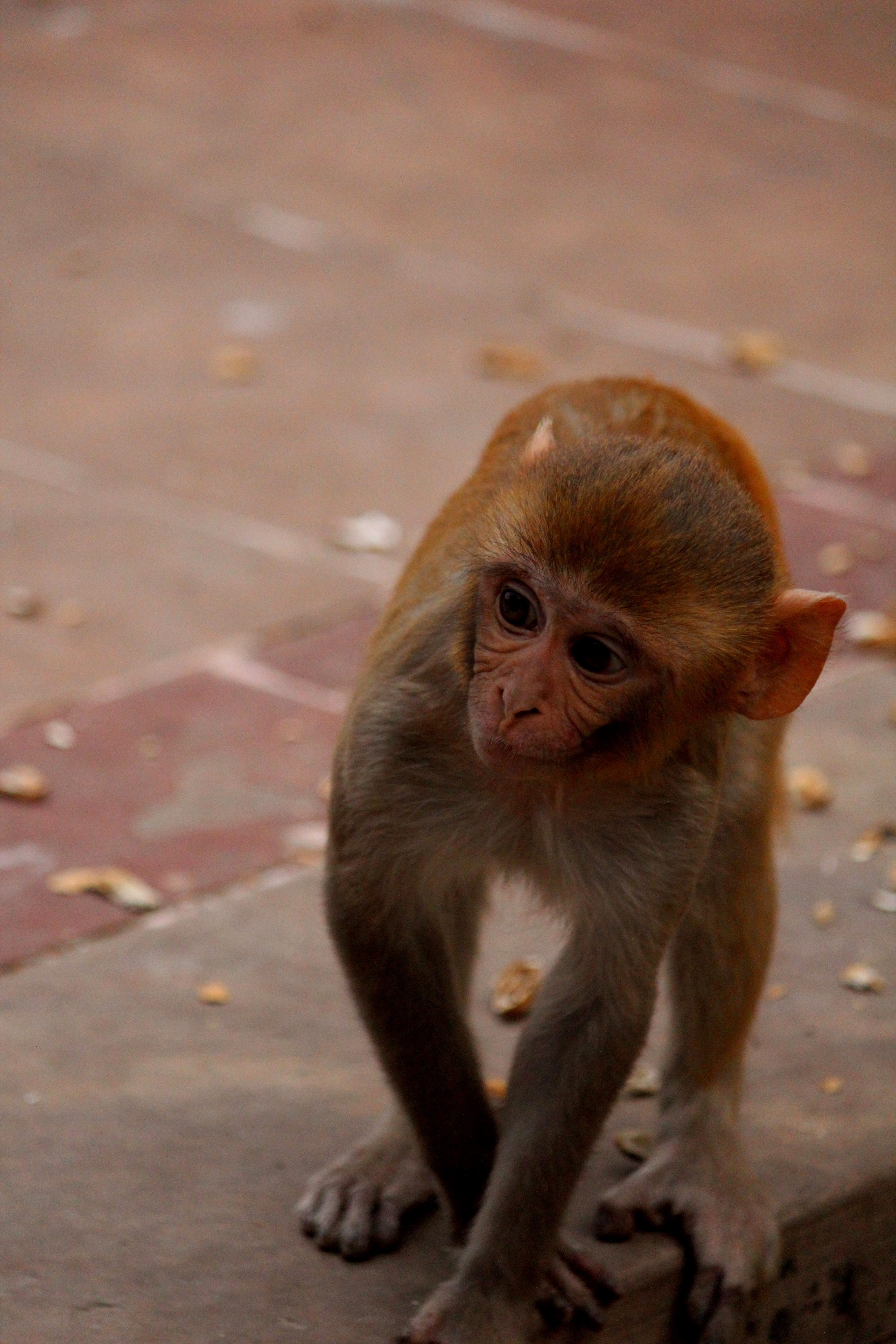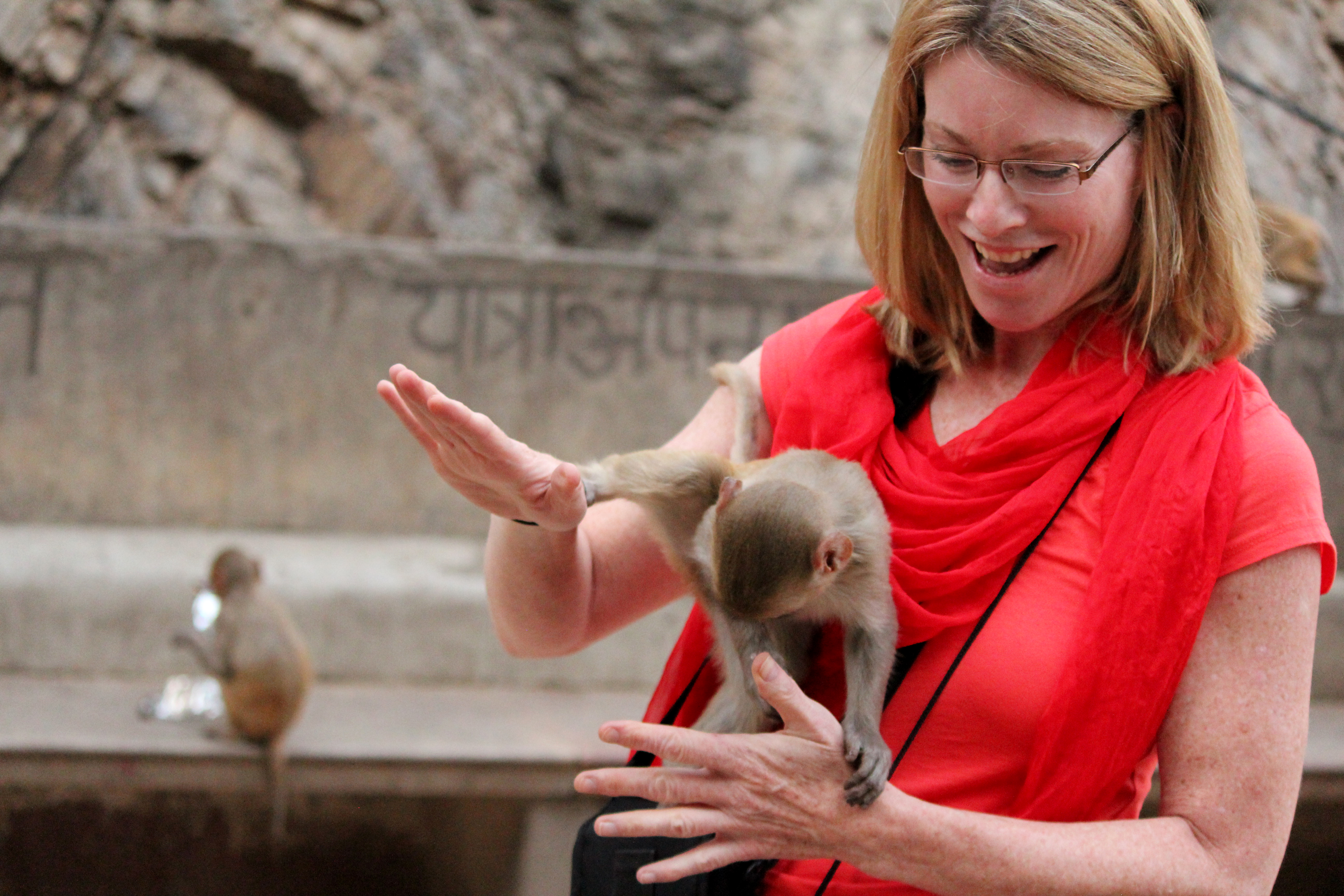 He tells me to give him my peanuts and camera, and tells me to hold one peanut so the monkeys have to reach for it. I do this while he takes photos. I laugh as the babies reach and play. I’m wary of the mothers; I have seen their wrath on my previous trip to India.