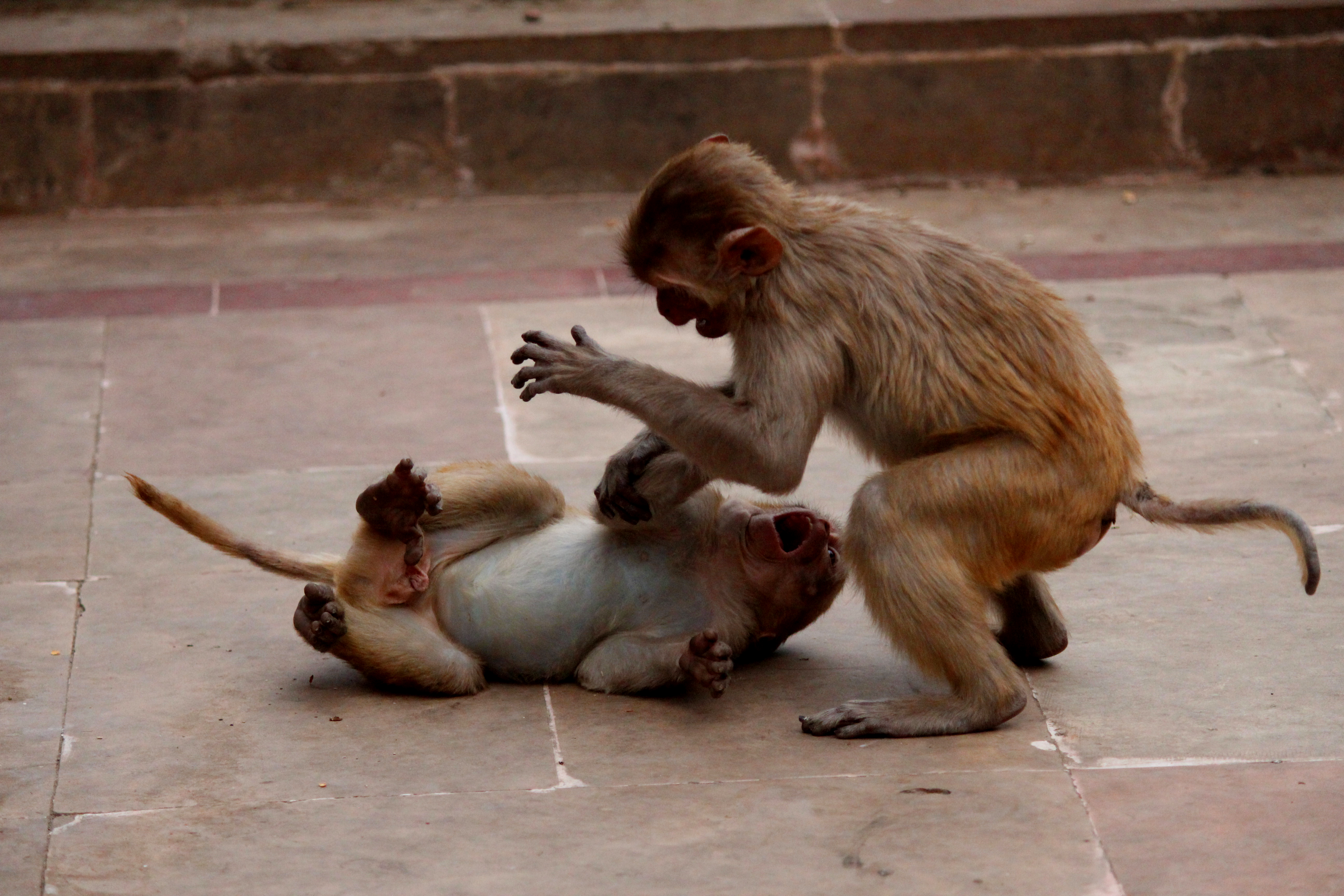 Then, the Macaques race up the stairs to chase the Langurs away. I ask the “whisperer” if he can bring them back. “No, they are afraid, they won’t be back.”